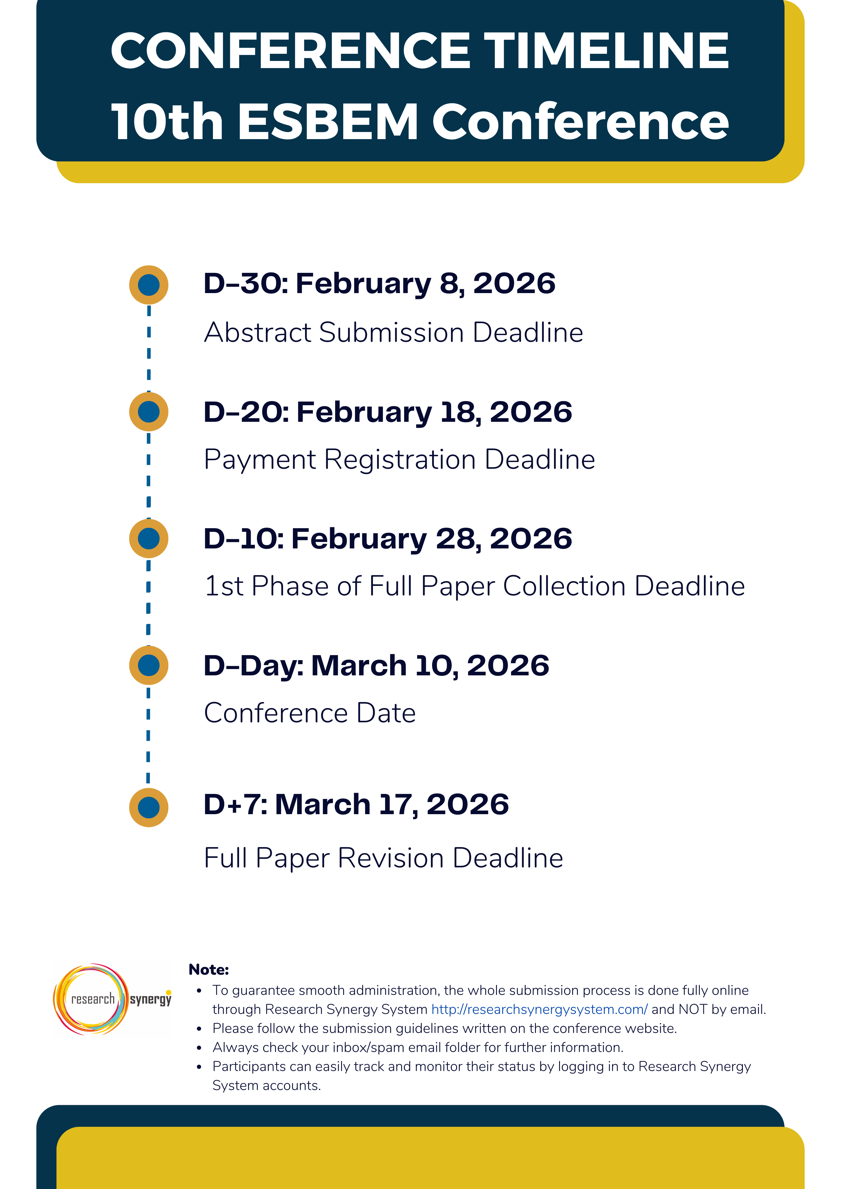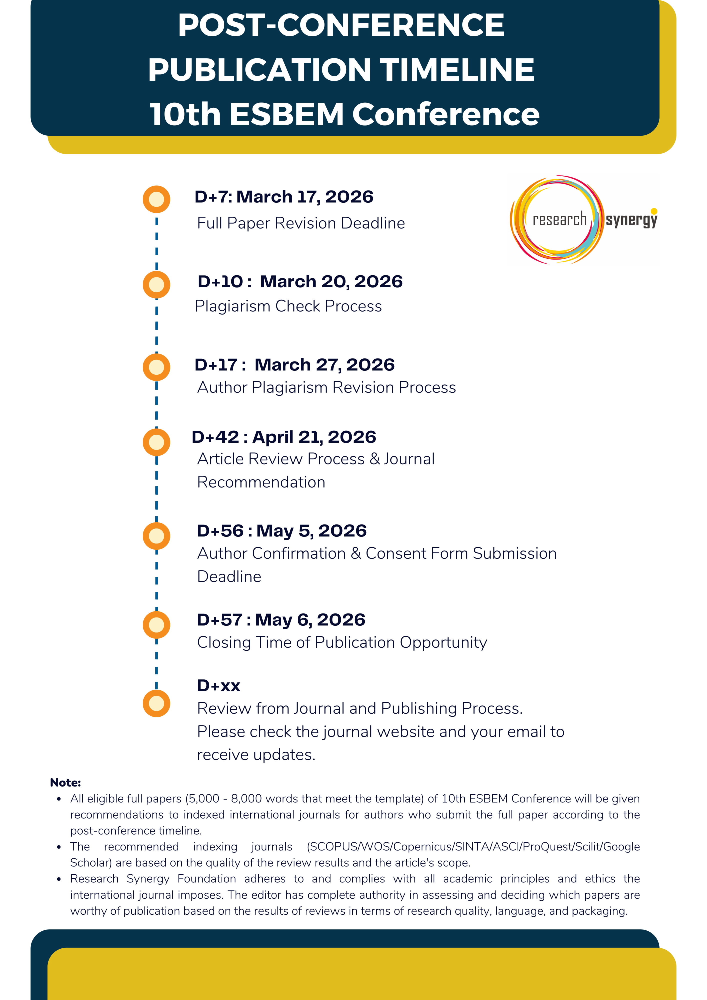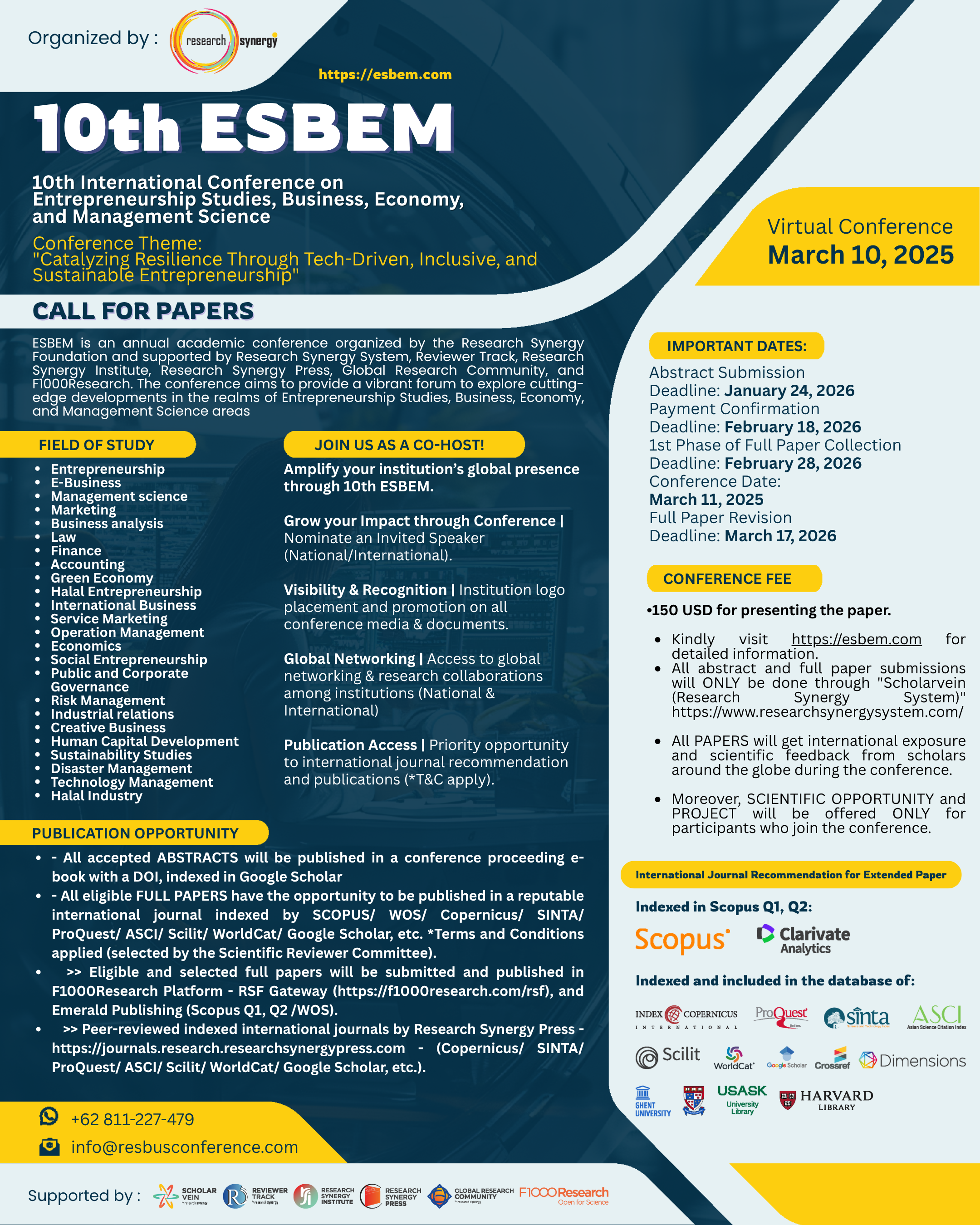 ESBEM is an annual academic conference organized by the Research Synergy Foundation, co-hosted by Universitas Lakidende and supported by Scholarvein, Reviewer Track, Research Synergy Institute, Global Research Community, and F1000 research. The conference aims to provide a vibrant forum to explore cutting-edge developments in the realms of Entrepreneurship Studies, Business, Economy, and Management Science areas.